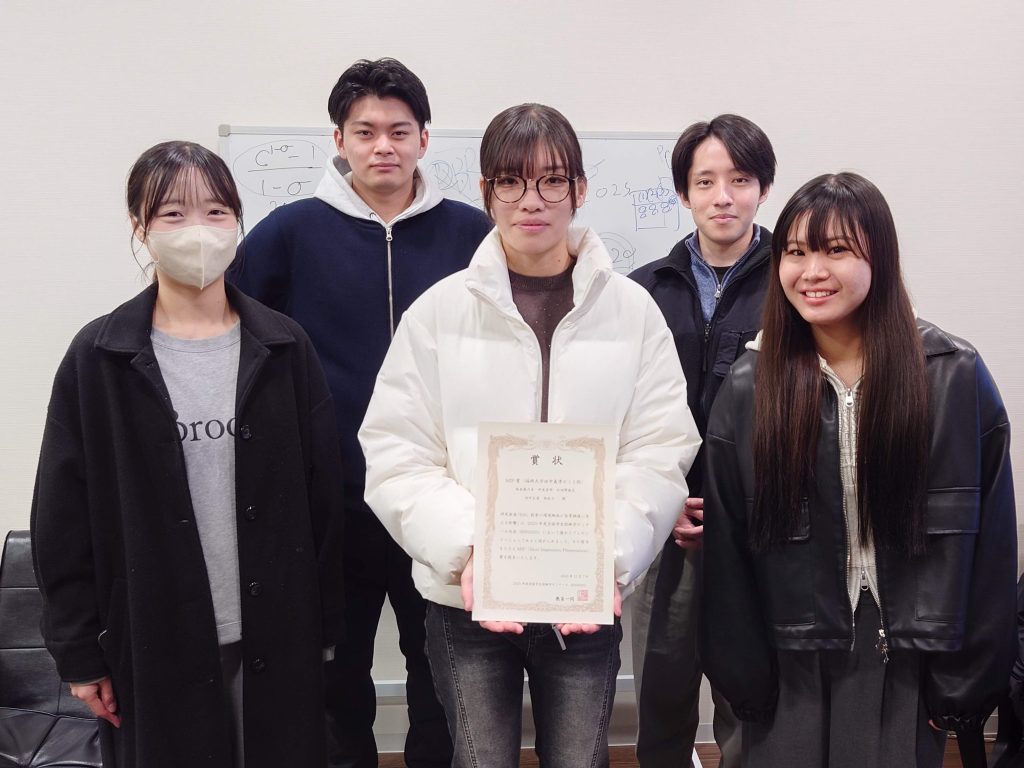 RISは2004年度から始まり、今回が22回目の大会でした。参加したゼミは保険関係ばかりでなく、金融、ファイナンス、社会保障、経営戦略などと幅広くなっています。今回は福岡大学・植村ゼミから3チーム、田中ゼミから2チームが参加し、このうち田中ゼミ1班(坂本亜沙美さん、仲本有那さん、松田野能花さん、田中至道さん、西拓斗さん)の研究報告「ESG 投資の環境側面が企業価値に与える影響」が、2日間の大会中で最も印象に残ったプレゼンテーション(MIP)の1つに輝きました。